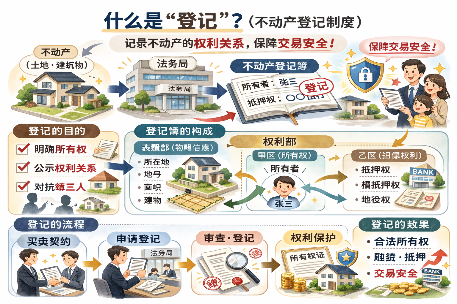 登记,是指将不动产(土地和建筑物)的权利关系及物理信息进行公示记录的制度。