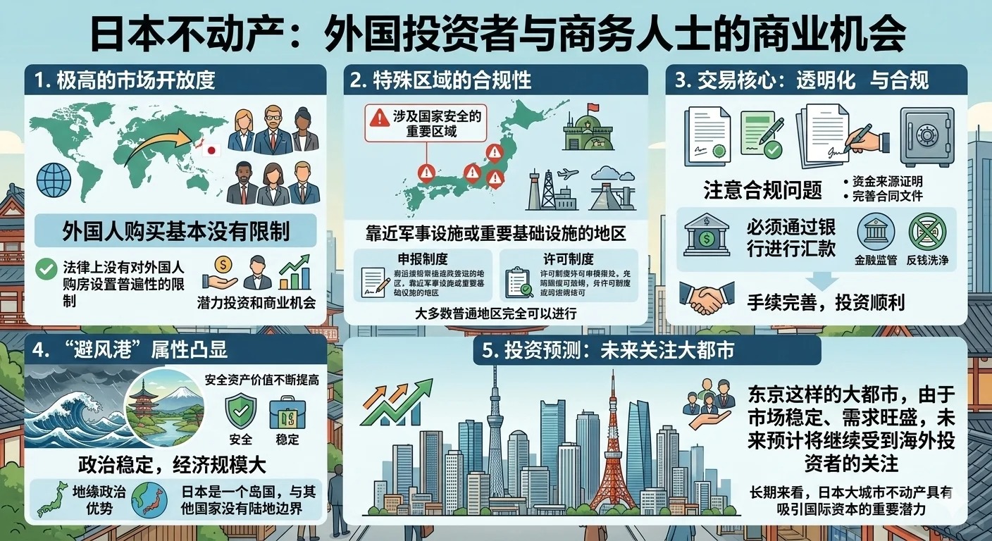 与许多国家不同,日本在不动产购买方面并没有对外国人设置严格限制。外国人无论是否拥有日本国籍、是否长期居住在日本,原则上都可以购买日本的土地、住宅、公寓或商业不动产。过去,日本社会中也曾出现过是否应当限制外国人购买不动产的讨论,但由于日本签署了相关国际协定,并且一直保持市场开放原则,目前法律上并没有针对外国人购房设置普遍性的限制。