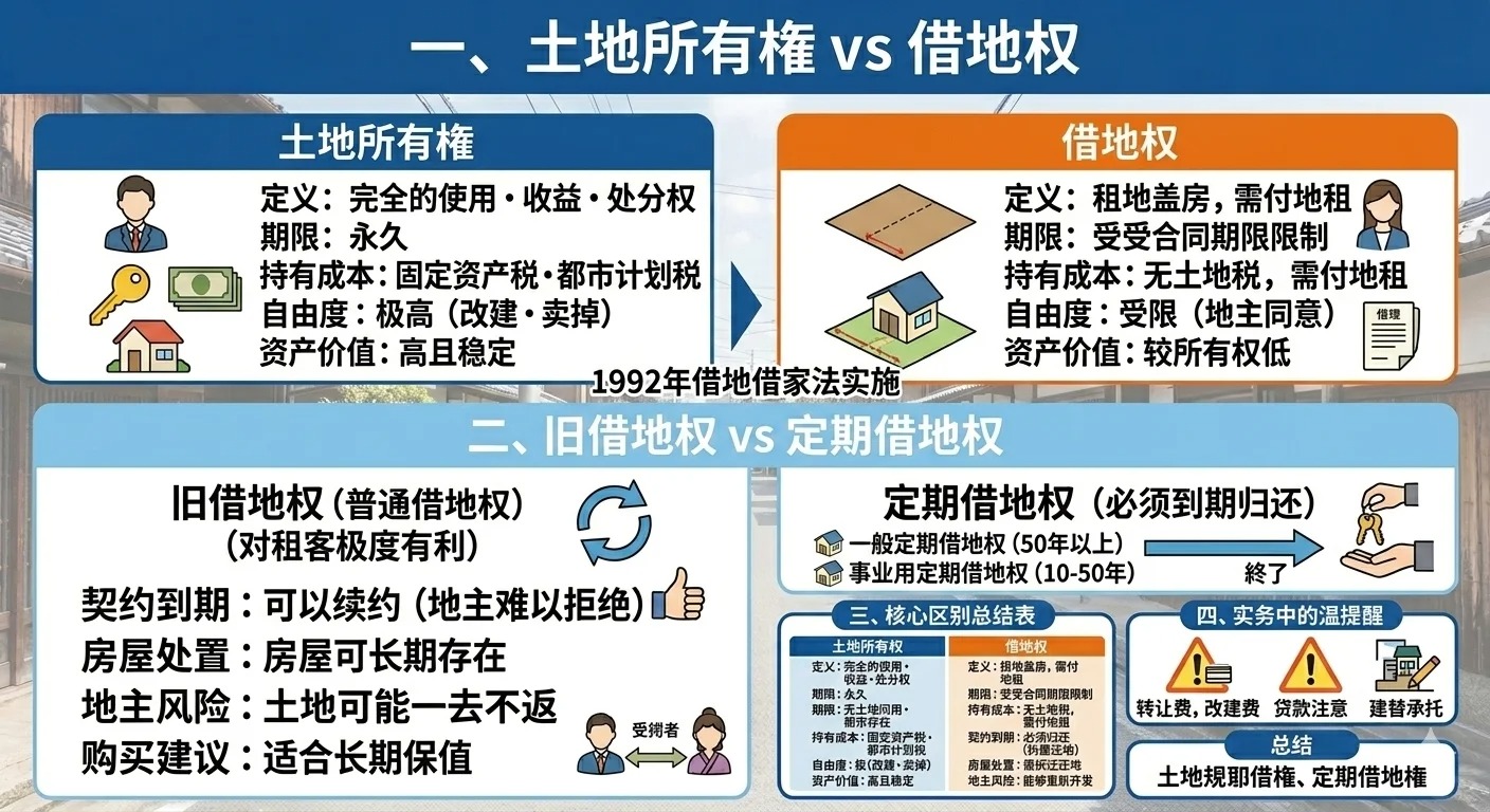 在探讨日本不动产时,理解“土地是谁的”以及“能用多久”是核心。 一、 土地所有权 vs 借地权 维度所有权 (Ownership)借地权 (Leasehold)定义完全拥有土地的使用、收益和处分权。支付地租,租用他人土地来盖自己的房子。期限永久,无期限限制。受合同期限限制(通常30年起)。持有成本需缴纳固定资产税、都市计划税。无需缴纳土地税金,但需支付地租。自由度极高,可自由改建、抵押、变卖。受限,改建或转让通常需征得地主同意。资产价值高且稳定,贷款审批相对容易。较所有权低,银行贷款评估较严。 二、 旧借地权 vs 定期借地权 这是最容易产生混淆的地方。日本在1992年实施了新法,导致目前市场上存在两种逻辑截然不同的借地权。 1. 旧借地权(普通借地权) 这是对租客(借地人)极度有利的权利形态。 “自动续约”的核心: 初始合同通常为30年,到期后只要租客想续约,地主除非有“正当理由”(极难成立),否则必须同意续约。 实质: 租客几乎等同于半个所有者,土地很难回到地主手中。 价值: 在二手房市场上,旧借地权的物件依然具有很高的流通价值。 2. 定期借地权(1992年后新设) 这是为了保障地主利益、促进土地流转而设立的,核心是**“到期归还”**。 一般定期借地权: 期限通常为50年以上。到期后,租客必须拆屋还地(恢复成绿地),不能续约。 事业用定期借地权: 期限10-50年,仅限商业用途。 特点: 土地成本极低(通常只有所有权的60%-70%),适合想在好地段用低预算盖房、且不打算代代相传的人。 三、 核心区别总结表 比较项目旧借地权 (普通)定期借地权契约到期可以续约(地主难以拒绝)必须归还(无法续约)房屋处置房屋可长期存在到期通常需拆迁还地地主风险土地可能“一去不返”能够定期收回土地重新开发购买建议适合自住、长期保值适合预算有限、追求高性价比居住者 四、 实务中的温馨提示 承租权转让费(名义变更费): 卖掉借地权上的房子时,通常要给地主一笔转让费(通常为借地权价格的10%左右)。 建替承托: 如果想拆掉旧房盖新房,旧借地权下也需要征得地主同意并支付一定的“承托金”。 贷款注意: 并不是所有银行都支持定期借地权的贷款,且贷款年限通常不能超过剩余的借地年限。