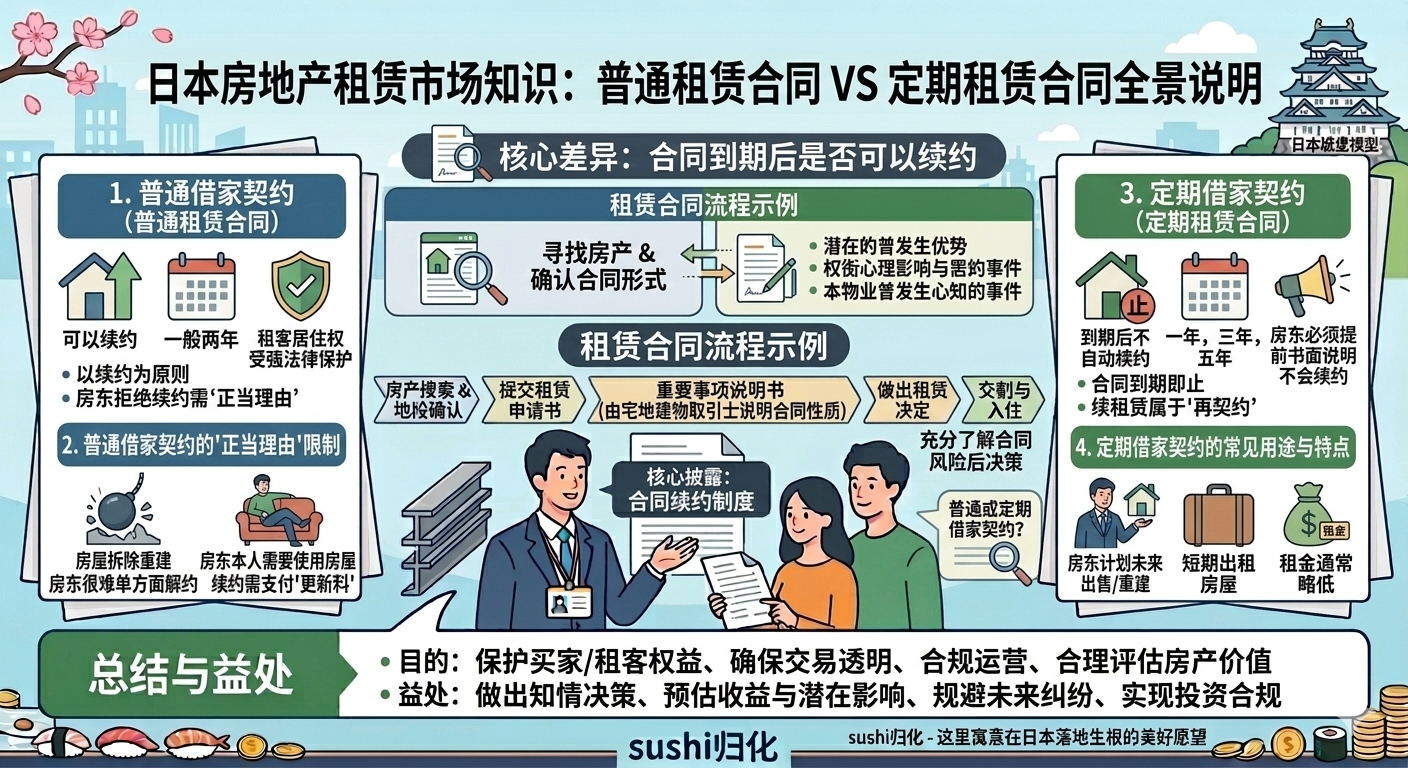 在日本的房地产租赁市场中,常见的合同形式主要有两种:普通租赁合同(普通借家契约)和定期租赁合同(定期借家契约)。两者最大的区别在于合同到期后是否可以自动续约