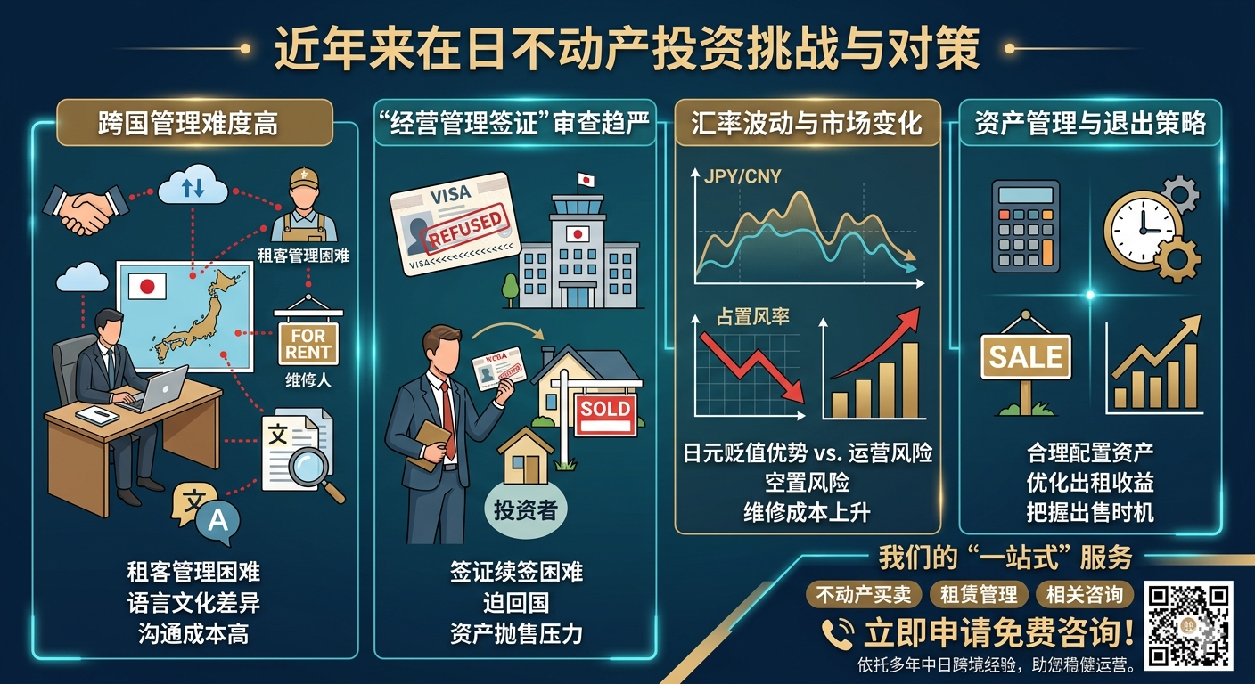 近年来,在日本购买不动产的中国投资者数量显著增加,尤其是在东京、大阪等核心城市区域,日本因其法律制度稳定、产权清晰且对外国人限制较少,被视为安全资产配置的重要选择。然而,在实际运营过程中,“购入之后的管理问题”逐渐凸显,成为许多业主面临的主要挑战。 首先,跨国管理难度较高。多数中国业主长期居住在中国,无法亲自处理租客管理、租金收取、维修维护等事务,只能依赖日本当地的管理公司。但由于语言及文化差异,部分业主对管理服务的质量和透明度存在疑问,沟通成本较高。 其次,日本政府近年加强了对外国人的管理政策,尤其是“经营管理签证”的审查明显趋严。一些原本以在日经营为前提购入不动产的投资者,因签证无法续签,被迫回国,从而不得不考虑出售名下房产。这一政策变化,使得不少投资计划被打乱,相关咨询明显增加。 此外,汇率波动及市场变化也对投资收益产生影响。日元贬值在购入阶段带来优势,但在出售或长期持有过程中,仍需面对空置风险、租金波动及维修成本上升等现实问题,导致部分投资回报不及预期。 在此背景下,“资产管理与退出策略”的重要性愈发凸显。如何合理配置资产、优化出租收益、把握出售时机,已成为关键课题。 本公司针对外国投资者提供一站式服务,包括不动产买卖、租赁管理及相关咨询。我们依托多年中日跨境业务经验,为客户提供专业且高效的支持。目前也提供免费咨询服务,协助客户应对复杂多变的市场环境,实现资产的稳健运营与合理退出。